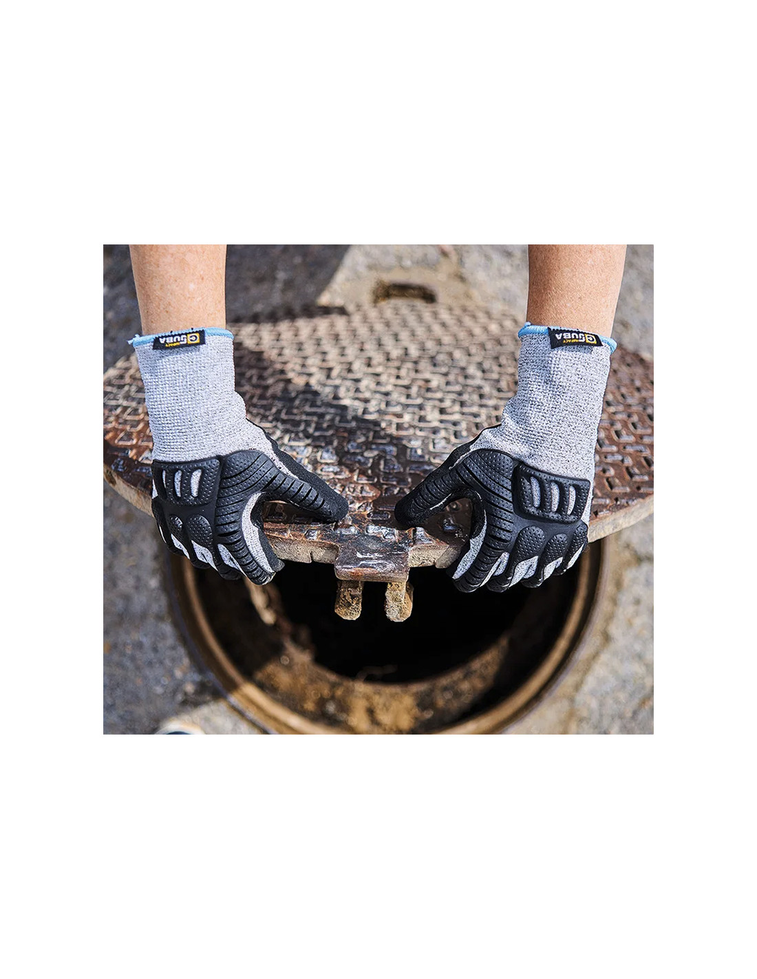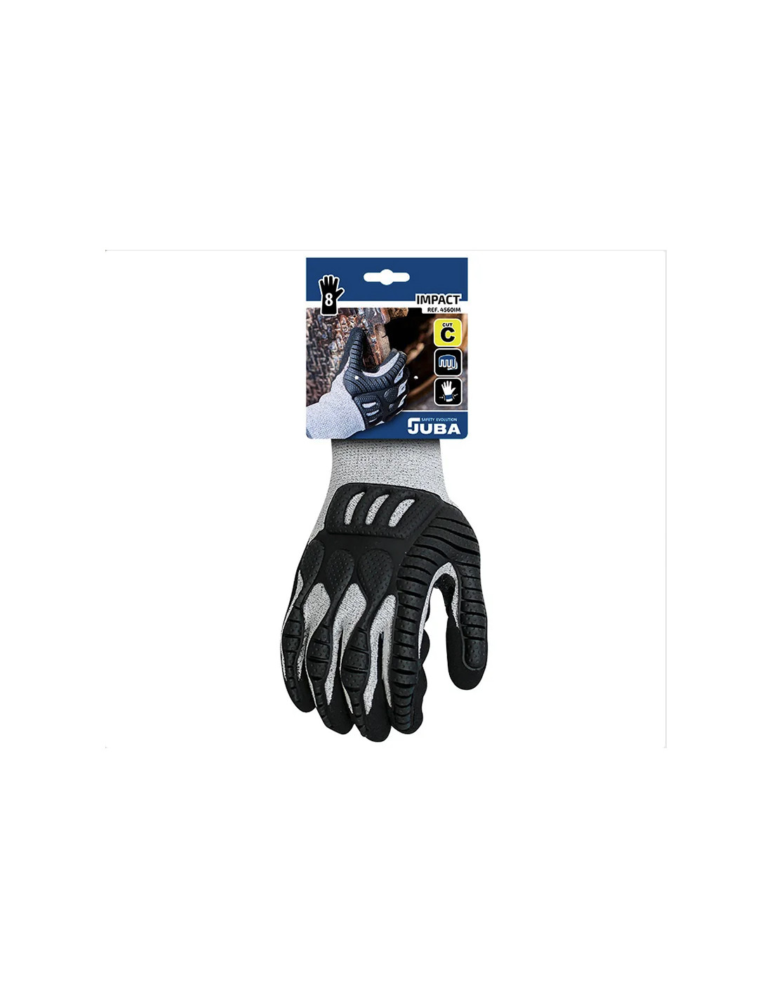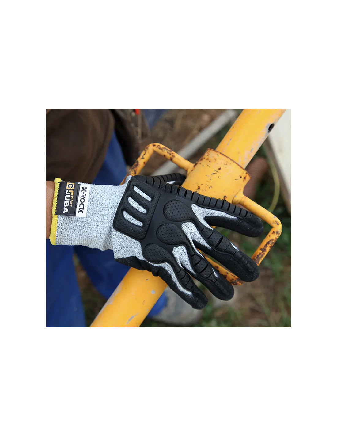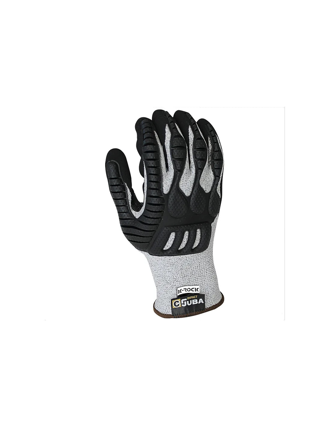 Guante con alta resistencia al corte que incorpora la fibra K-ROCK®, nueva tecnología de corte de Juba, con recubrimiento de nitrilo arenoso protectores anti-impacto TPR y palma acolchada.