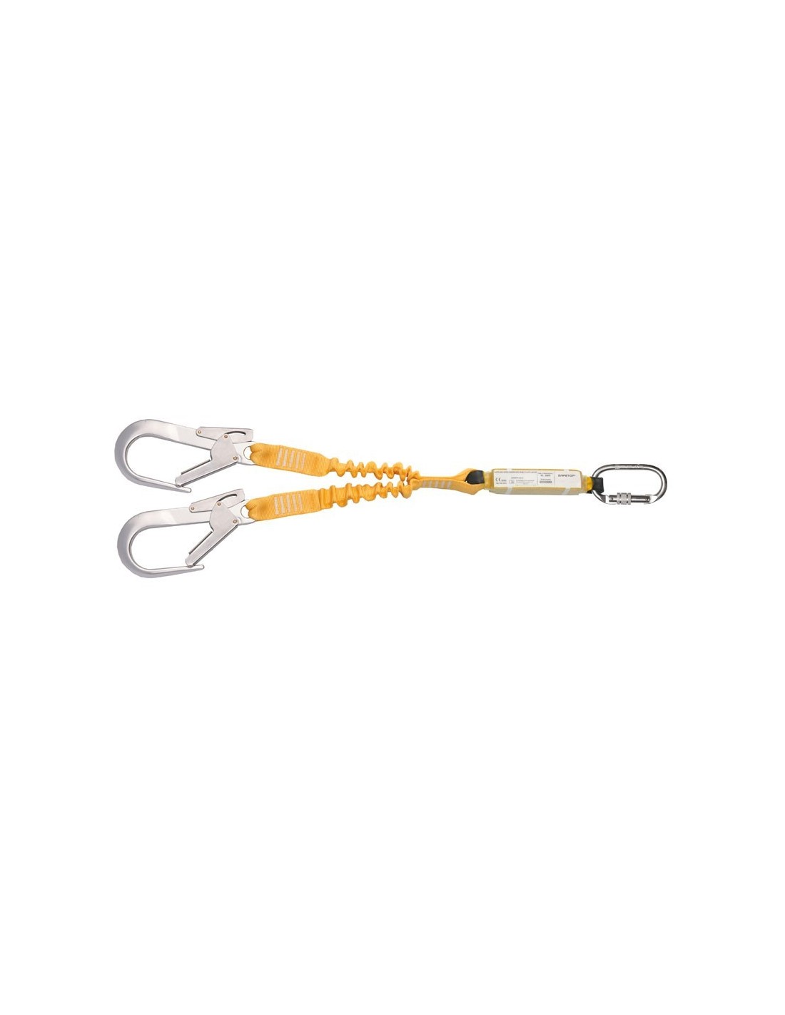 Amarre doble con absorbedor y mosquetones (1,9 m). Doble cinta de poliéster de 1,90 m (incluyendo los mosquestones y absorbedor). Podrá alcanzar hasta 2 metros, añadiéndole un mosquetón al extremo del absorbedor..